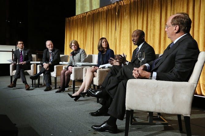 Larry Fink, right, shared a stage with several of the CEOs he urged to spend more time doing good.