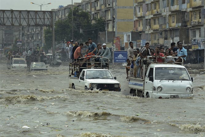 Pakistani commuters travel on a flooded street following a heavy rainfall in Karachi, Aug. 31, 2017.