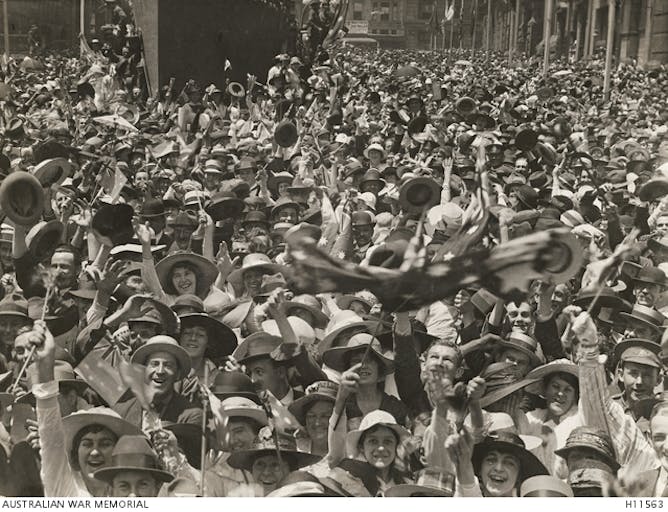 A crowd at Martin Place, Sydney, celebrates the news of the signing of the Armistice on November 11 1918.