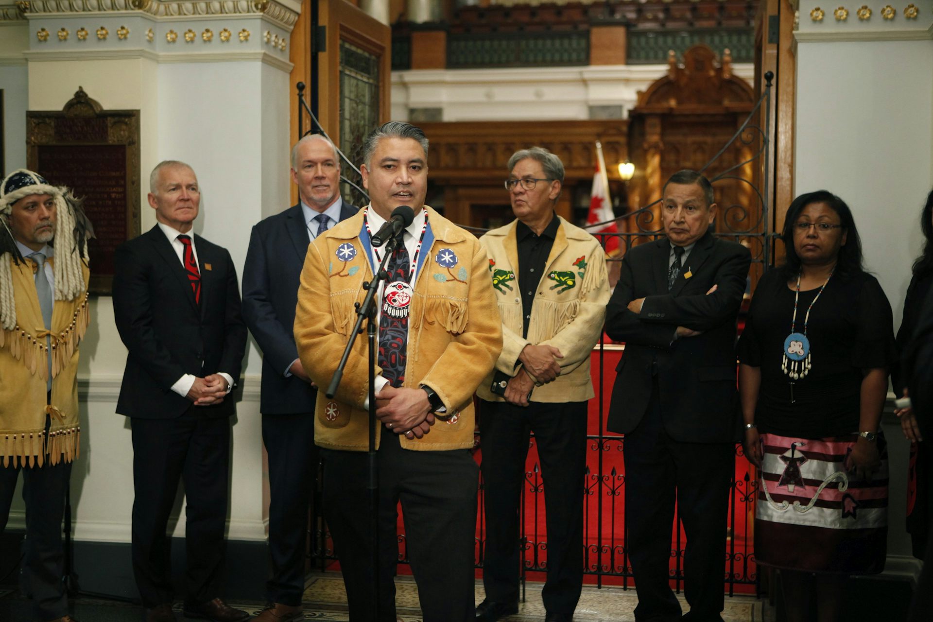 Regional Chief Terry Teegee speaks to the press n Victoria on Oct. 24, 2019 after Premier John Horgan announced Indigenous human rights will be recognized in B.C. with new legislation .