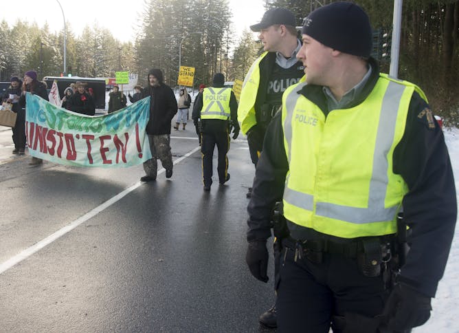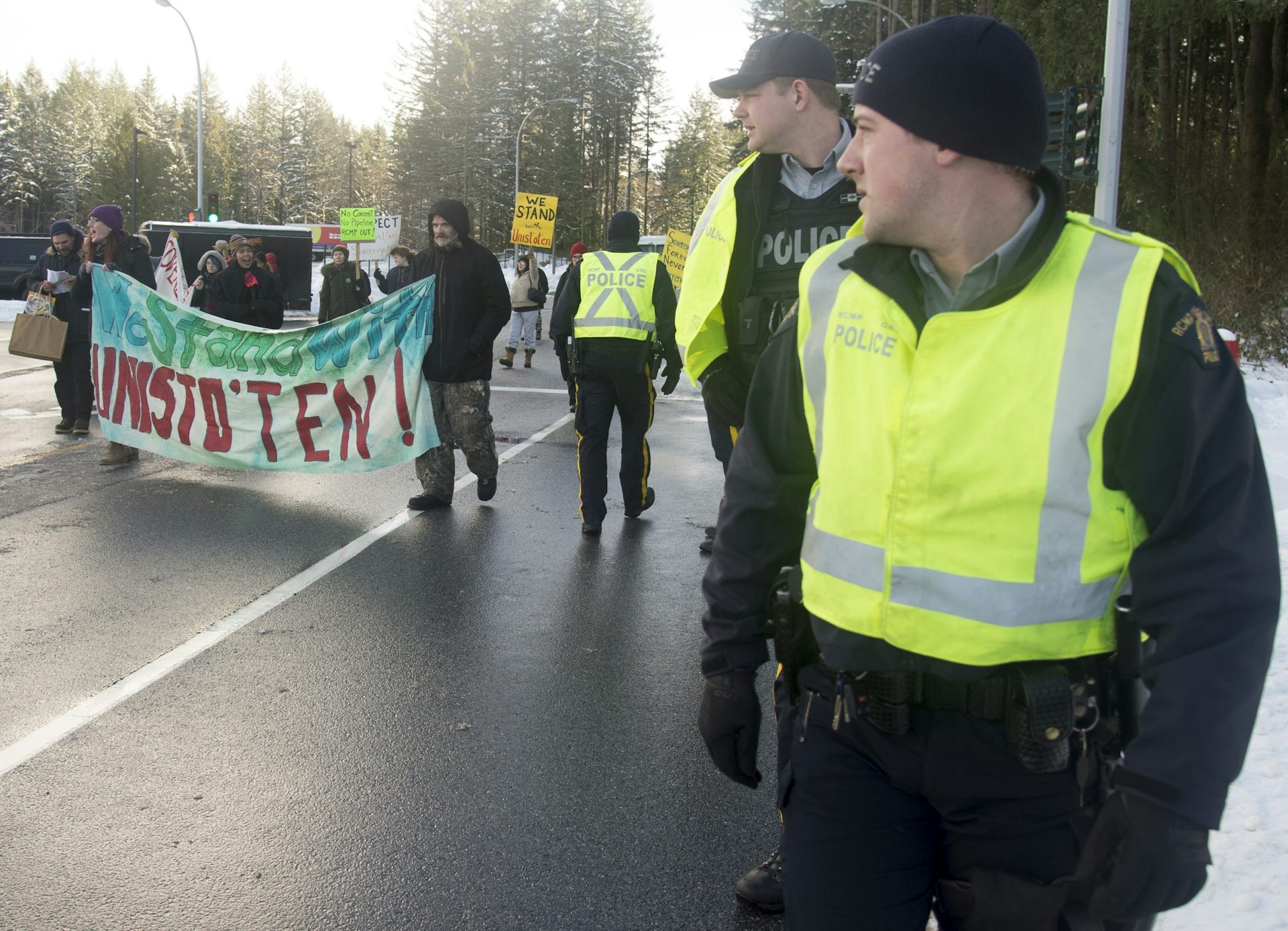 Members of the RCMP look on as supporters of the Wet'suwet'en Nation block a road outside of RCMP headquarters in Surrey, B.C., on Jan. 16, 2020.