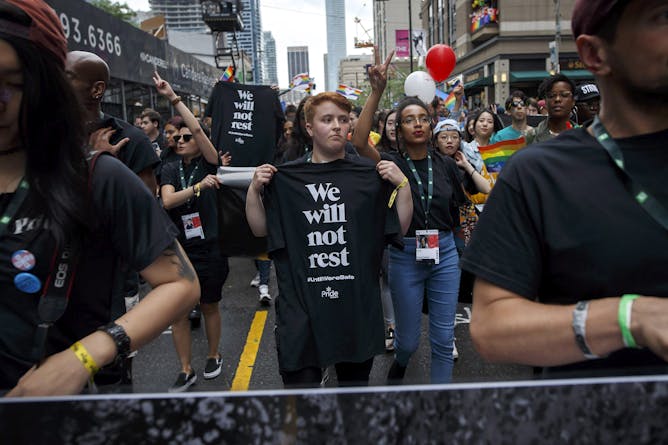 A tribute to those lost from the community, people march with We Will Not Rest #UntilWe'reSafe t-shirts during Toronto Pride parade on June 24, 2018. Many feel the recent killings in Toronto might have received more attention had the victims not been homosexuals or racialized men.