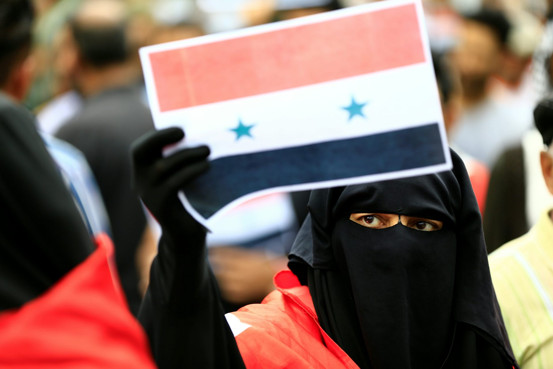 A woman holds a Syrian flag during a protest against air strikes on Syria in Baghdad, Iraq on April 15, 2018.