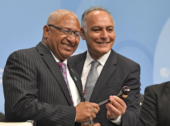 COP 22 President Salaheddine Mezouar from Morocco, right, hands over a gavel to Fiji’s prime minister and president of COP 23 Frank Bainimarama, left, during the opening of the U.N. Climate Change Conference in Bonn, Germany, Monday, Nov. 6, 2017.