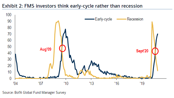 Many more investors say the global economy is in an early-cycle phase (70%, highest since January 2010) as opposed to recession (12%), which as seen in 2009 & 2012 is a key recovery milestone. <br>