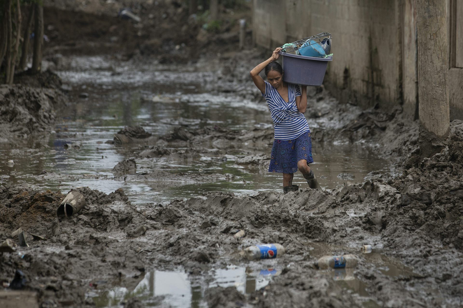 A woman wades through mud to collect items from her home in San Pedro Sula, Honduras. The devastation brought by hurricanes Eta and Iota in Honduras in November 2020 contributed to a sharp rise in northward migration.