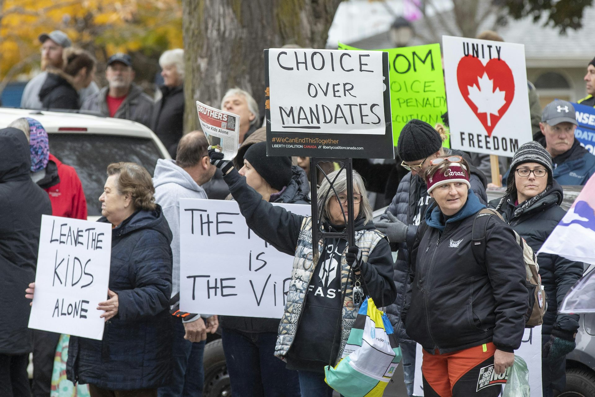People gather in Kingston, Ont., to protest COVID-19 vaccine mandates and masking measures on Nov. 14, 2021.