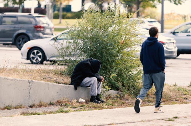 Un homme passe devant une personne recroquevillée sur un trottoir à Barrie, en Ontario, en 2023. Les Canadiens ont une vision de plus en plus pessimiste de l’économie et des finances.