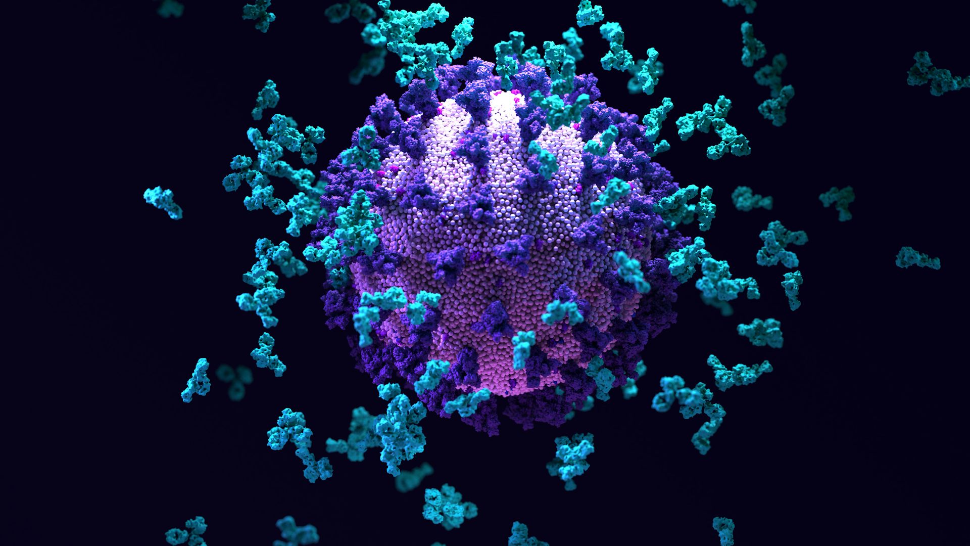 Antibodies (light blue) binding to the spike proteins (dark purple) on the outside of the coronavirus.