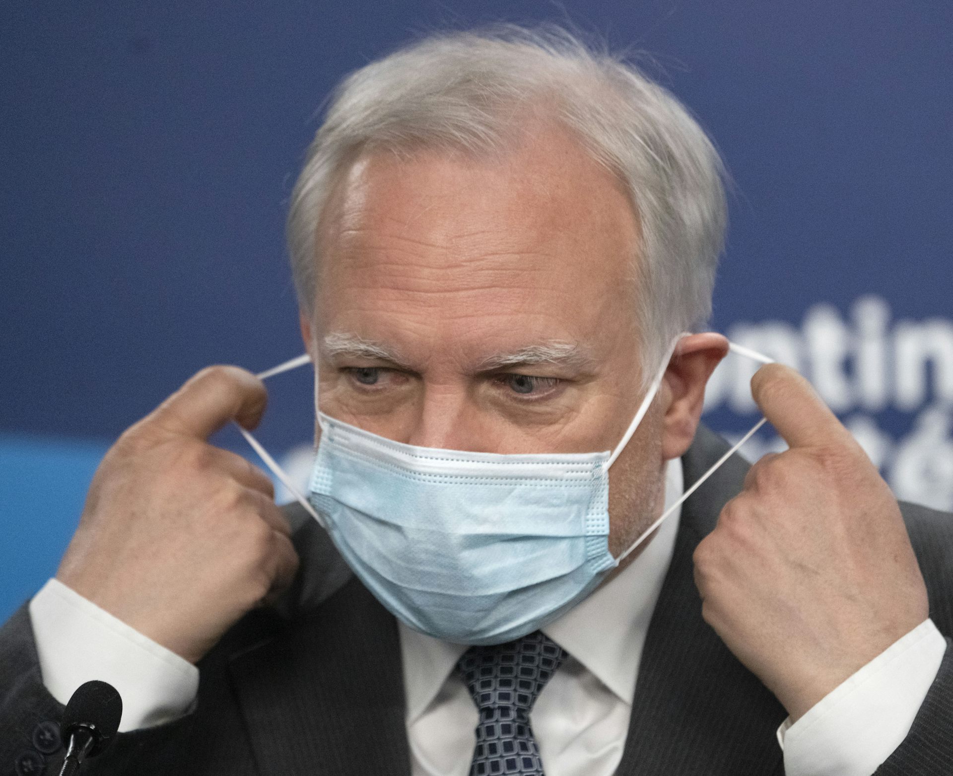 Le directeur par intérim de la santé du Québec, le Dr Luc Boileau, enlève son masque alors qu'il arrive pour faire le point sur la Covid-19, le 21 avril 2022 à Montréal. Le ministère de la Santé du Québec recommande la prolongation du mandat du masque jusqu'à la mi-mai.