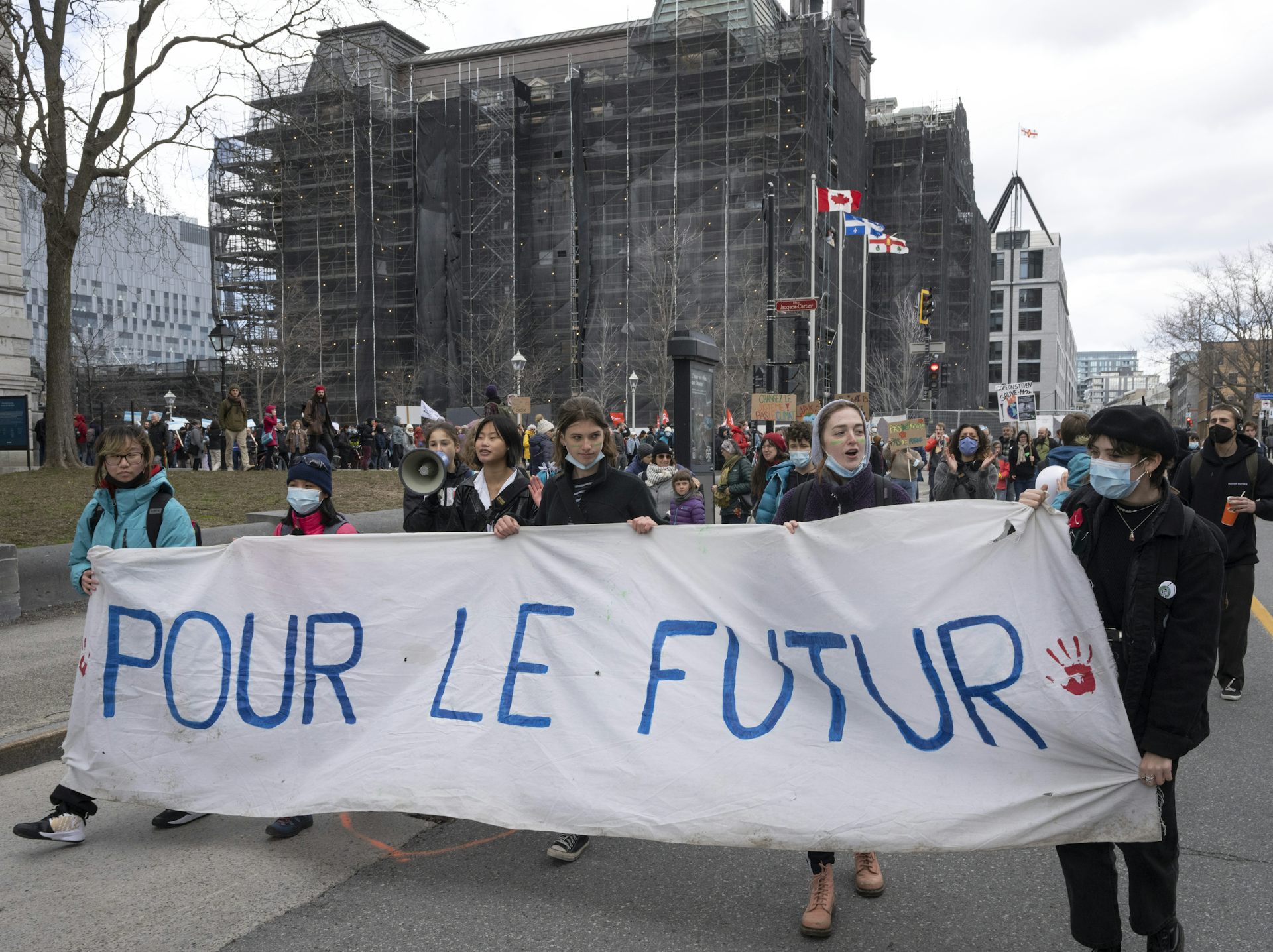 Des personnes marquent le Jour de la Terre par une marche, le 22 avril 2022, à Montréal.