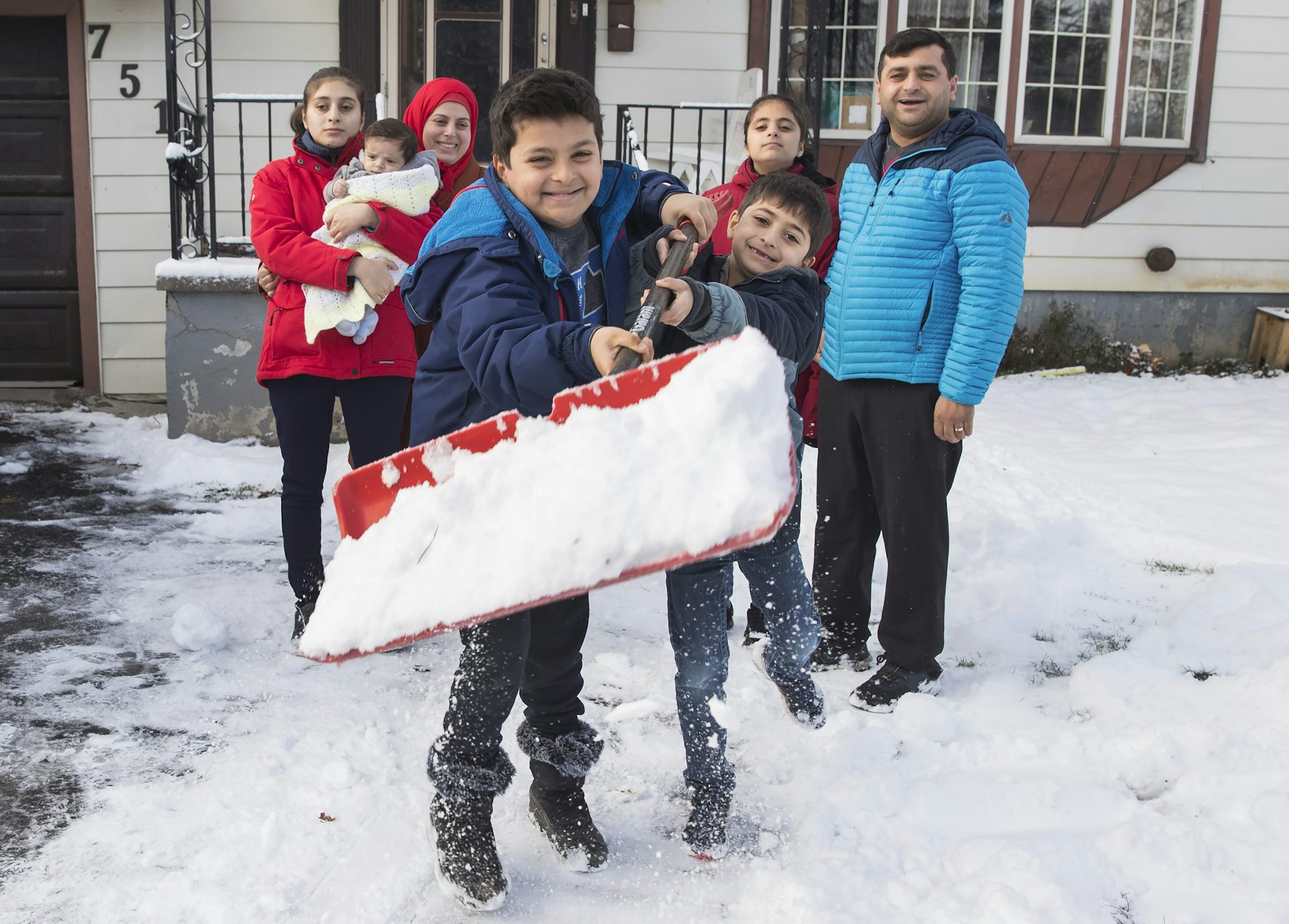 A Syrian-Canadian family poses outside their home in Peterborough, Ont., in December 2021. They were among thousands of Syrian refugees resettled in Canada by April 2017 under a program introduced by the Liberal government in 2015 — and now thousands of Afghan refugees are arriving in Canada, many of them under the age of 18.
