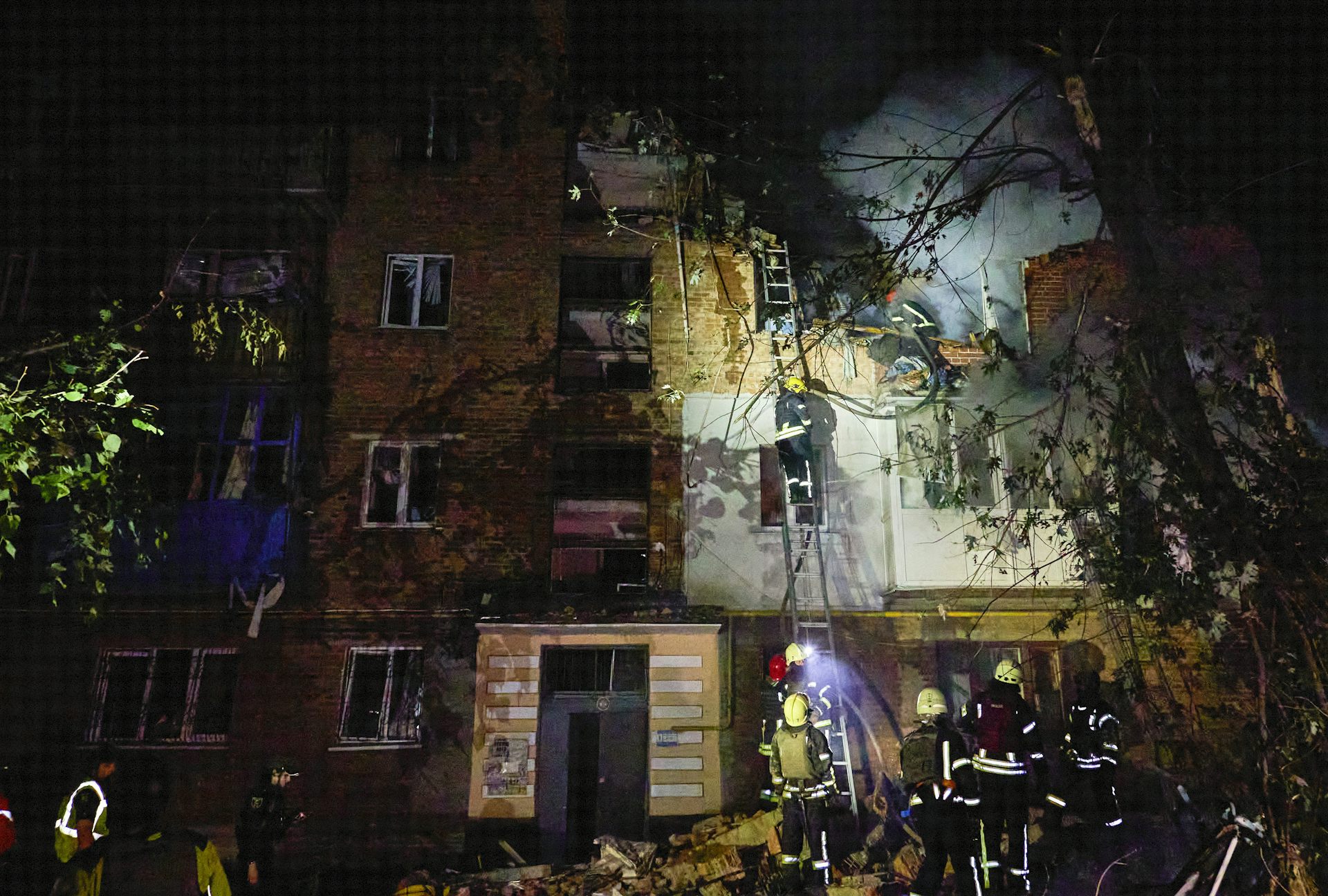 Firefighters battle a blaze in a residential area of Kharkiv, Ukraine’s second city which has been under Russian bombardment since the war began.