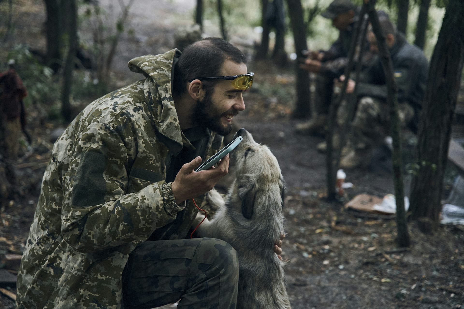 Un soldat ukrainien joue avec un chien dans le territoire libéré de la région de Kharkiv en Ukraine, le 12 septembre 2022. Les troupes ukrainiennes ont repris une grande bande de territoire à la Russie.