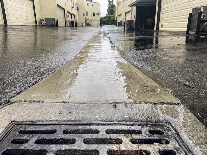 Water runs into a storm drain in a Los Angeles alley on Aug. 19, 2023, during Tropical Storm Hilary.