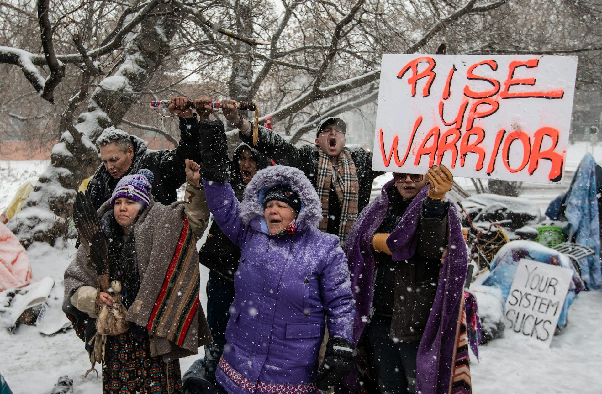 Unhoused people and supporters protest against police as they prepare to clear homeless encampments in Edmonton on Jan. 9, 2024.
