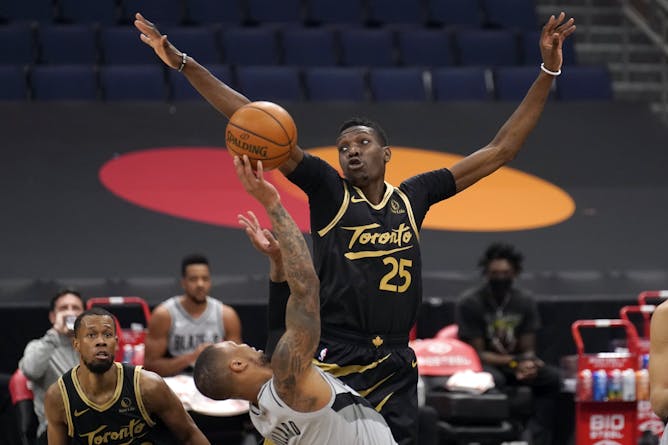 Toronto Raptors forward Chris Boucher fouls Portland Trail Blazers guard Damian Lillard during the first half of an NBA basketball game on March 28, 2021 in Tampa, Fla.