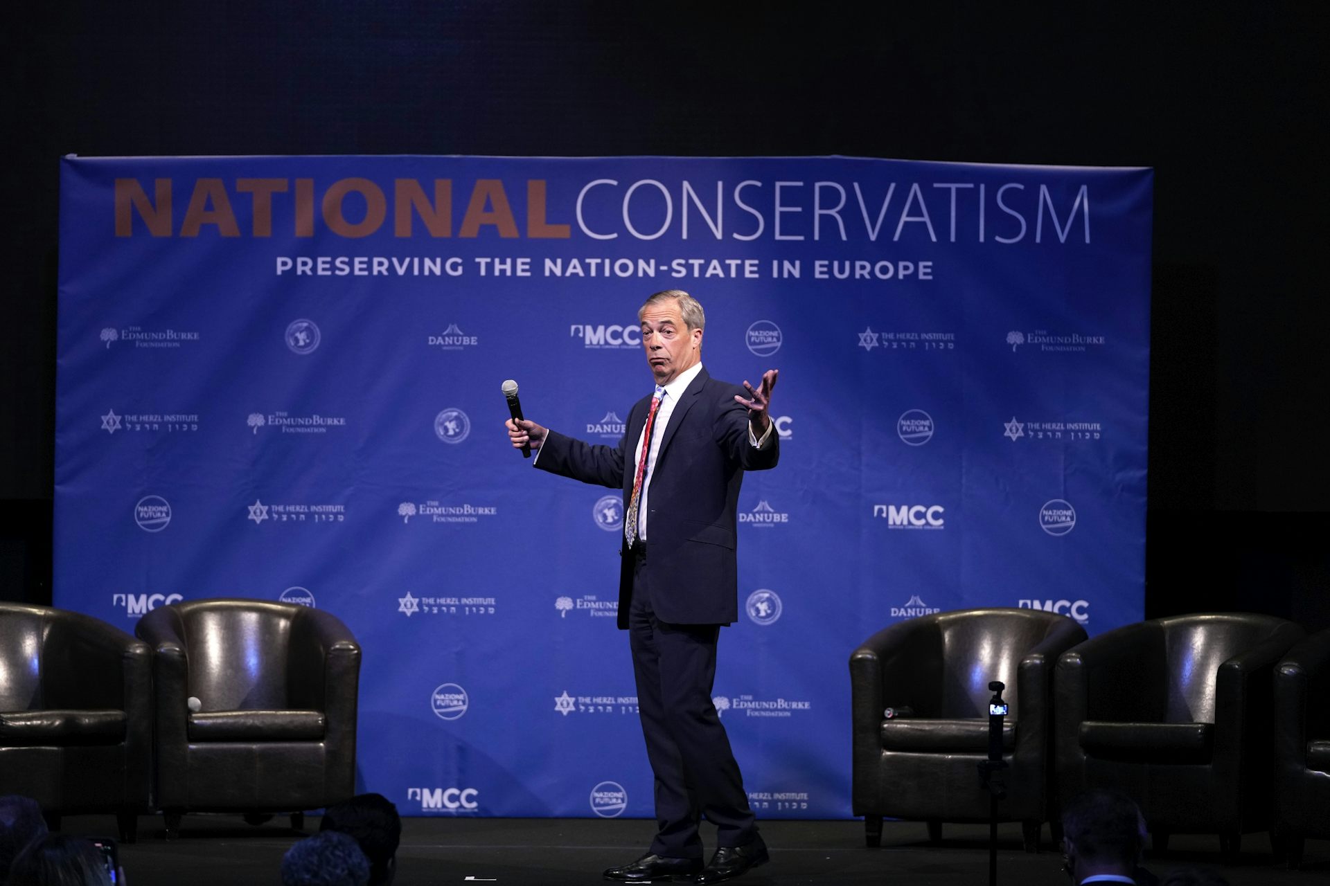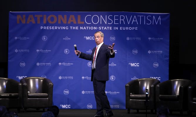 Nigel Farage, former leader of the UK Independence Party, speaks during the National Conservatism conference in Brussels on April 16, 2024.