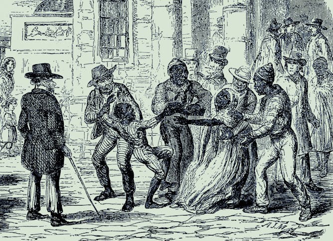 In this drawing from ‘Uncle Tom’s Cabin,’ a Black child is taken from his mother by a white man.