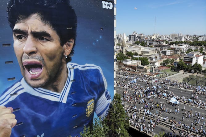 Argentina fans celebrating their team’s World Cup victory walk past a mural of Diego Maradona in Buenos Aires. While shared nationality is a factor, most fans typically think about players in terms of their club team.