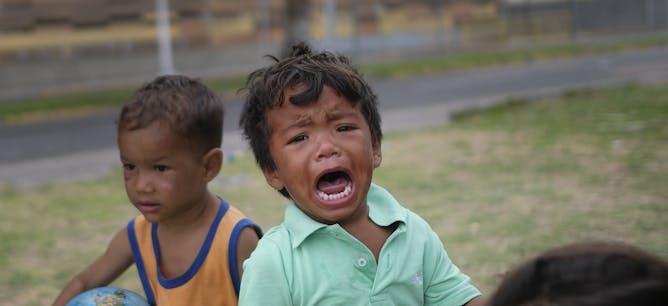 A Venezuelan migrant child cries after the police told his family to break up a camp they had set up on the seashore in El Morro, a neighbourhood of Iquique, Chile, in December 2021.