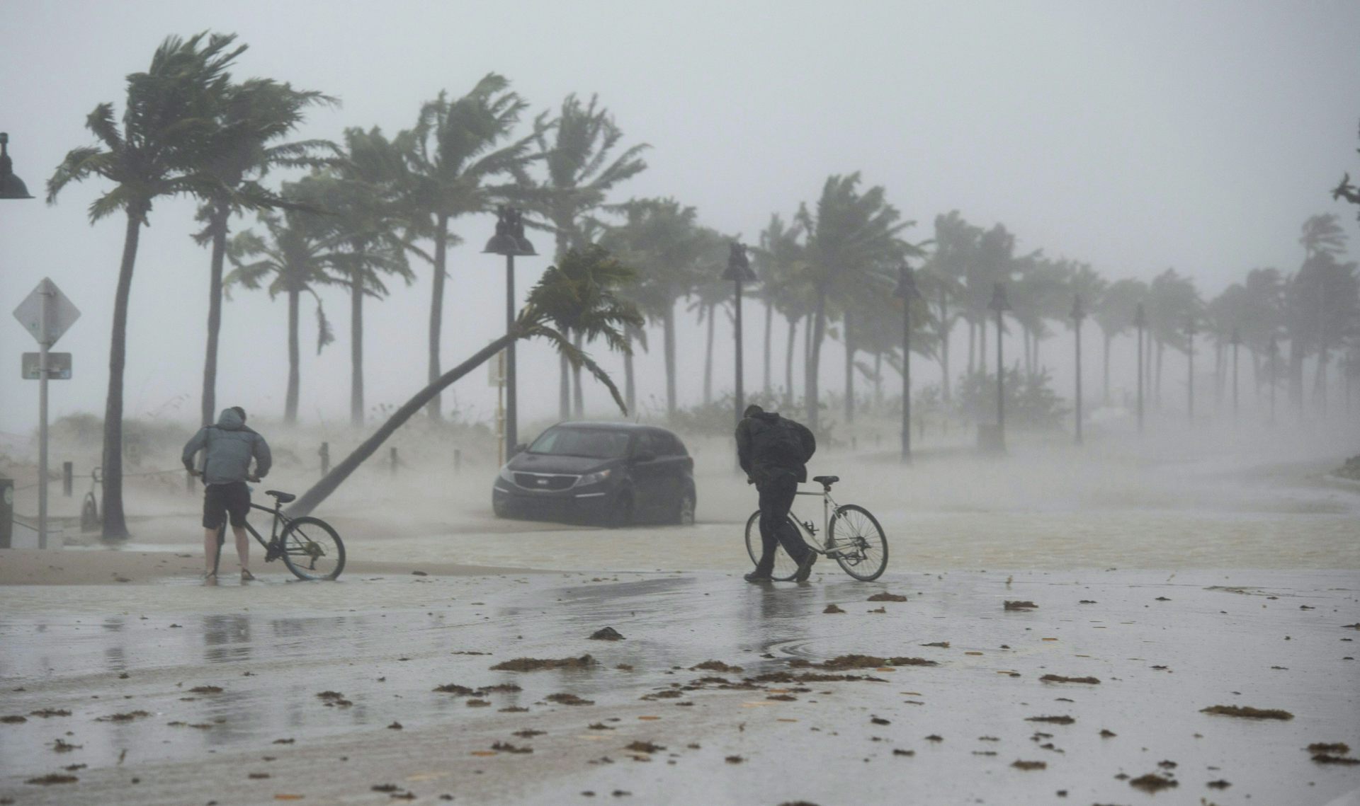 Two people walk their bicycles along a flooded street on the waterfront of Fort Lauderdale, Fla., as Hurricane Irma passes through on Sept. 10, 2017.
