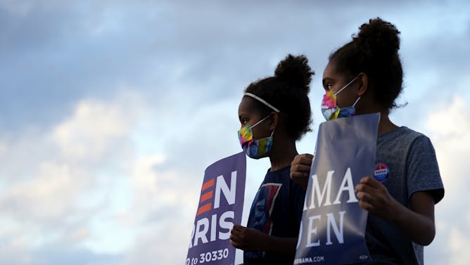 Teacher activism in the U.S. has helped pushed the Democratic party towards renewed investment in public education. Children listen as former president Barack Obama campaigns for Democratic presidential candidate Joe Biden, Oct. 21, 2020, in Philadelphia.