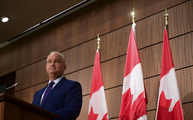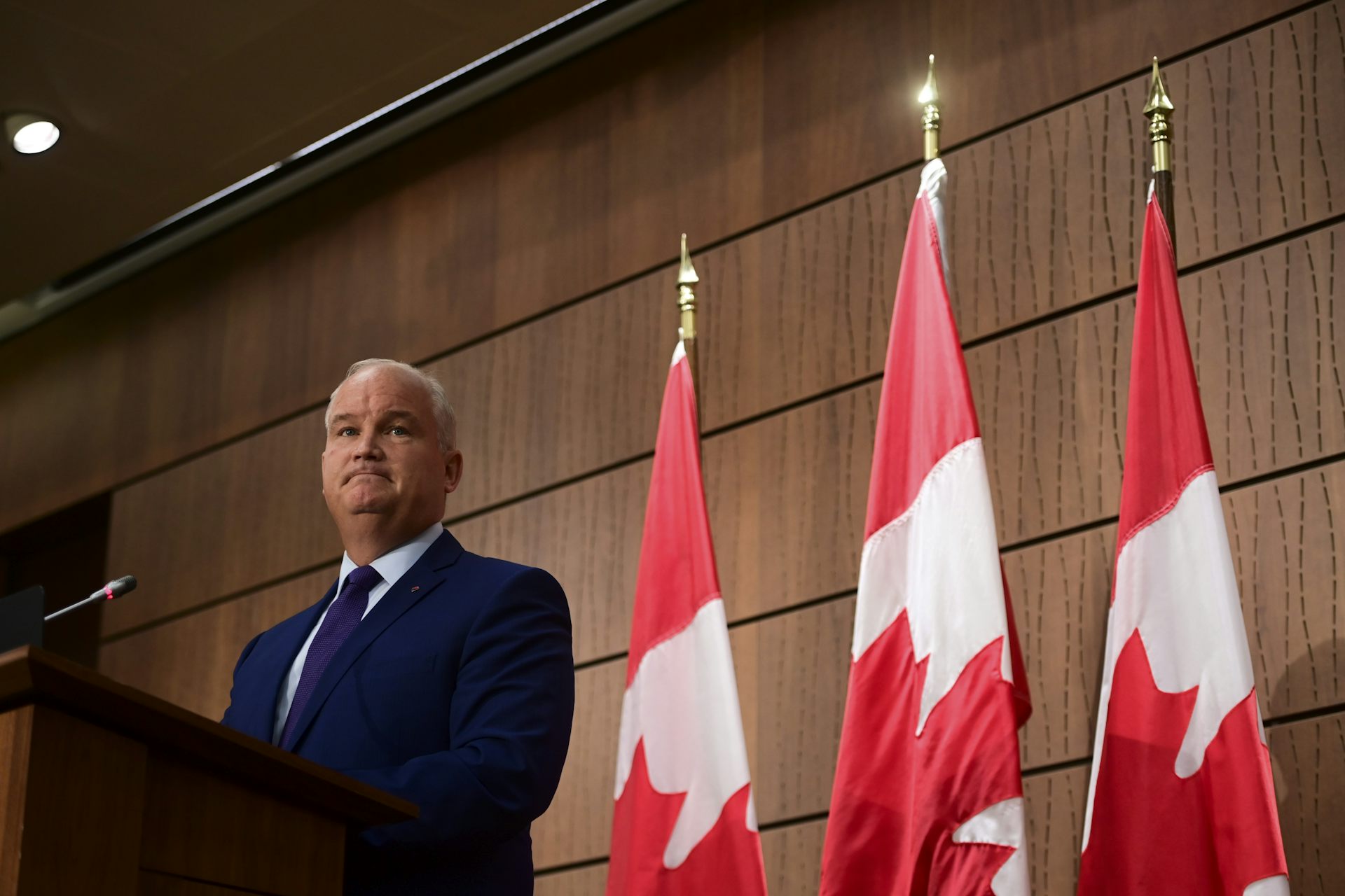 Conservative Leader Erin O'Toole holds his first news conference as leader on Parliament Hill in Ottawa in August 2020.