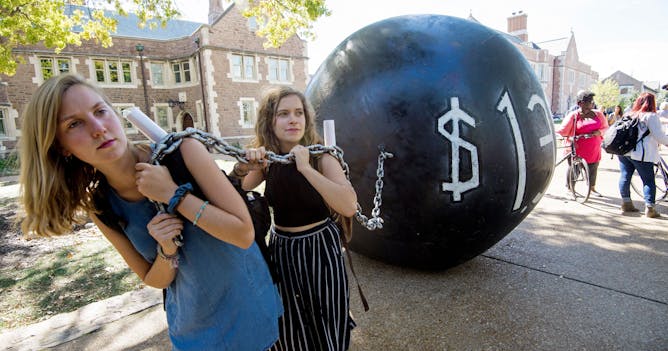 Students pulling a heavy ball representing the total outstanding student debt in the U.S. at over $1.5 trillion.