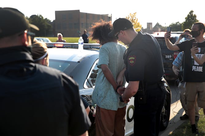 An activist is arrested after his van was stopped by Kenosha police Aug. 27, days after police shot a Kenosha man, Jacob Blake, seven times in the back, leaving him paralyzed.