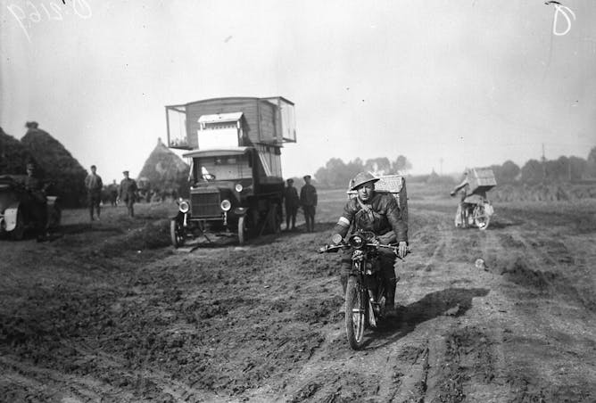 Dispatch rider with pigeons leaving for firing line, His Majesty’s Pigeon Service, November 1917, location unknown.