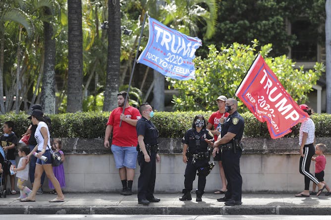 Police speak to a group of Trump supporters who were campaigning near a polling station on Nov. 3, 2020, in Honolulu.