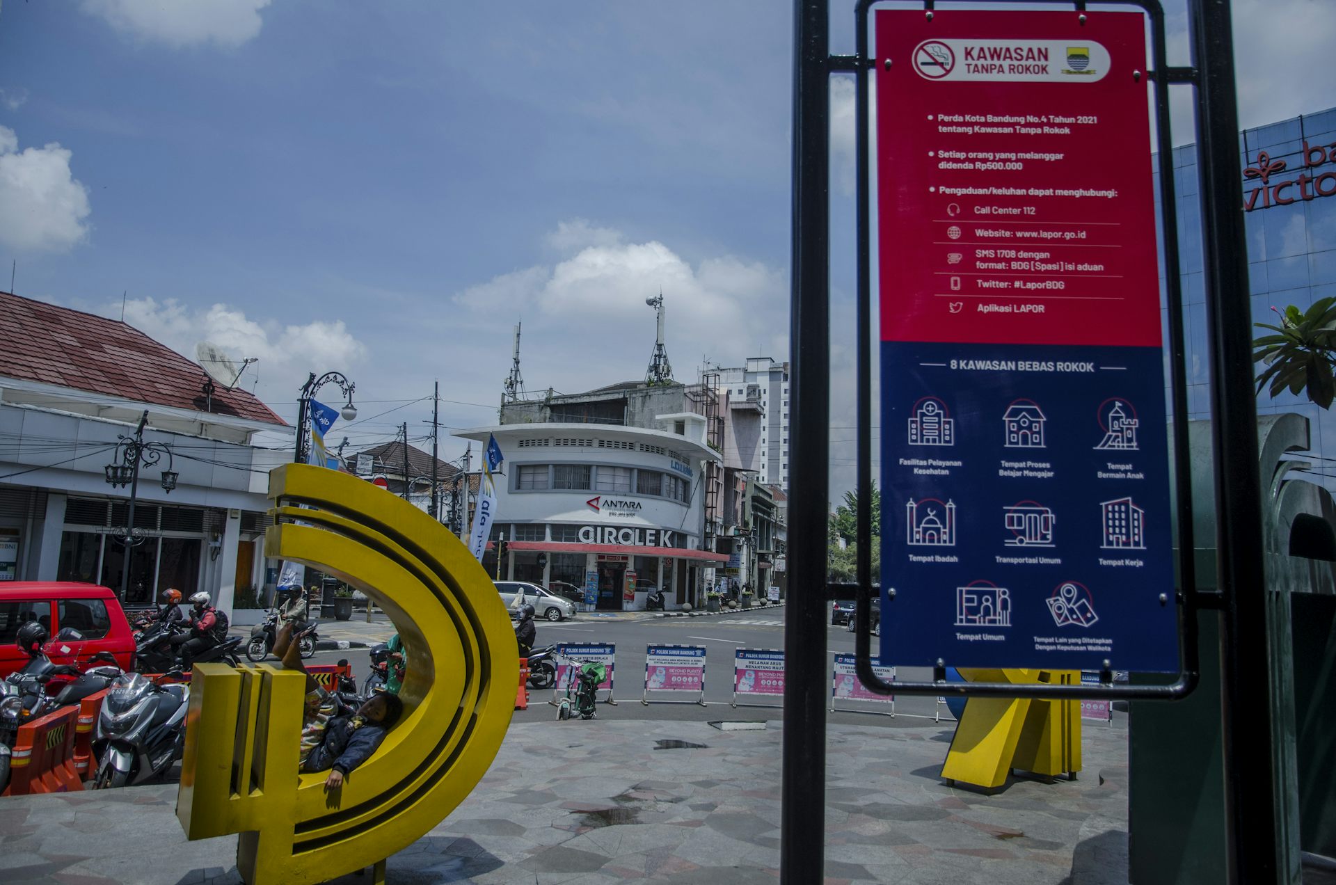 Seorang anak bermain di Taman Braga, Bandung, Jawa Barat, 17 November 2021. Pemerintah Kota Bandung menjadikan Jalan Braga sebagai kawasan tanpa rokok.