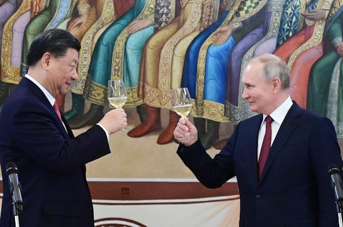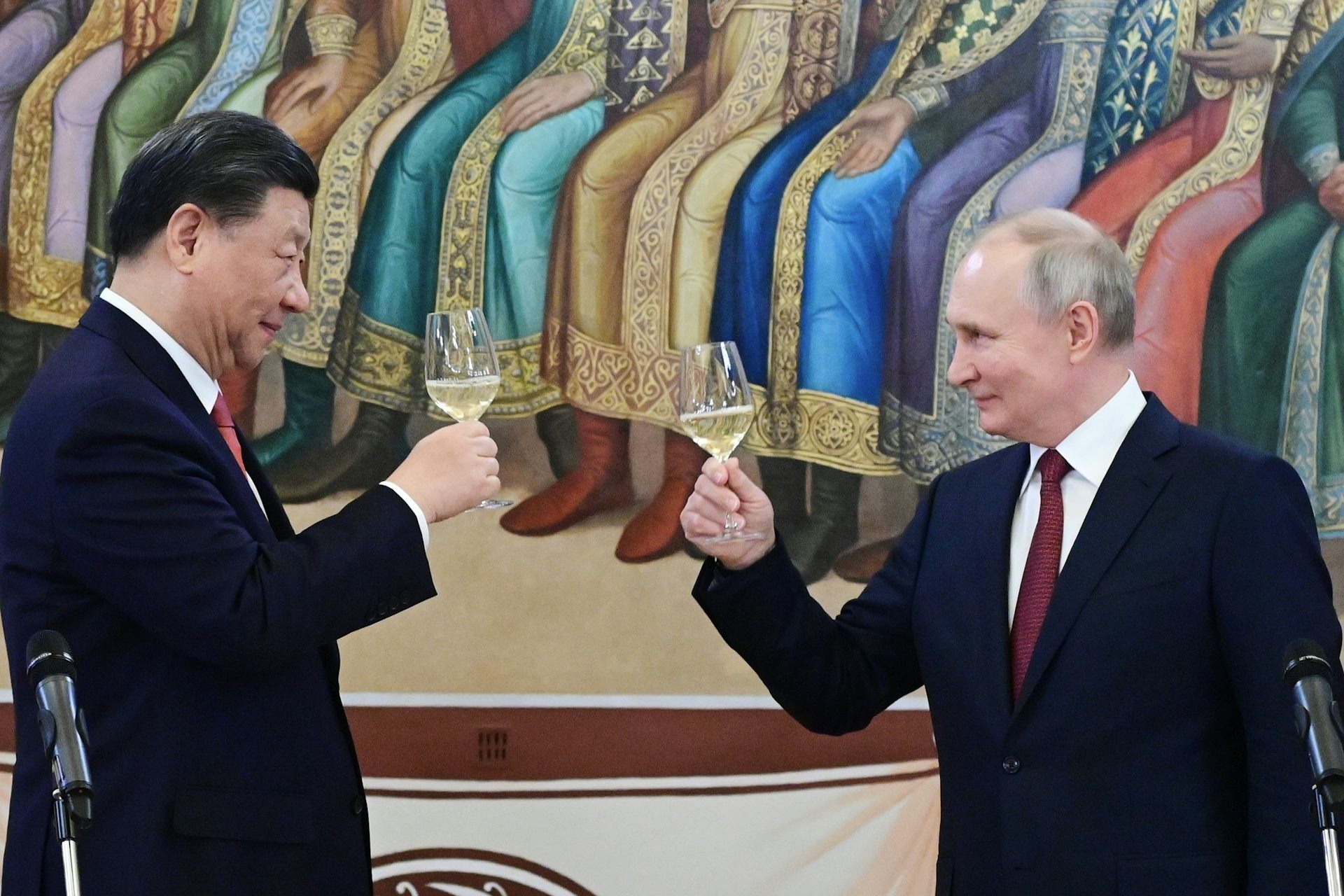Le président chinois Xi Jinping et son homologue russe Vladimir Poutine portent un toast lors de leur dîner au Kremlin, à Moscou, en mars 2023.