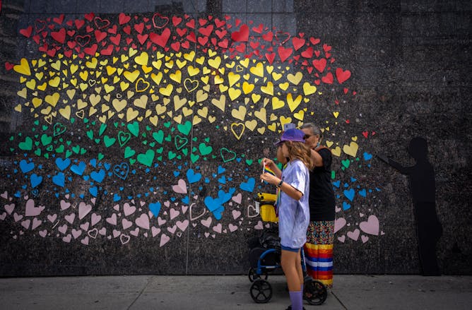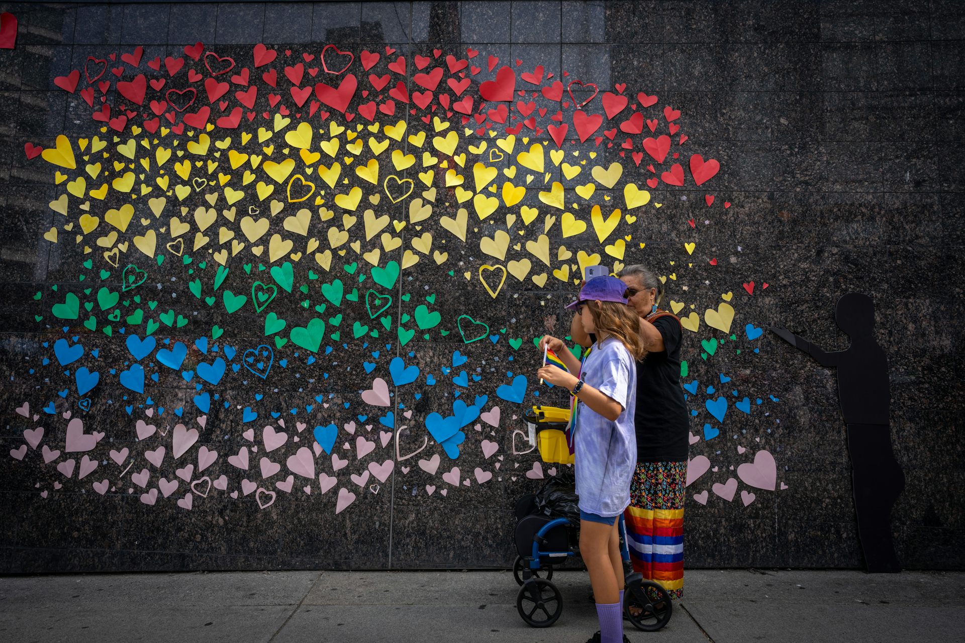 People pass a decorated wall during the Pride Parade at English Bay in Vancouver, B.C, Aug. 6, 2023.