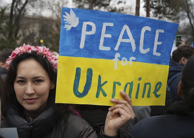 A demonstrator holds a pro-Ukraine sign during a protest against Russia’s invasion of Ukraine in Almaty, Kazakhstan — a former Soviet republic that has largely stayed neutral during the conflict — in March 2022.