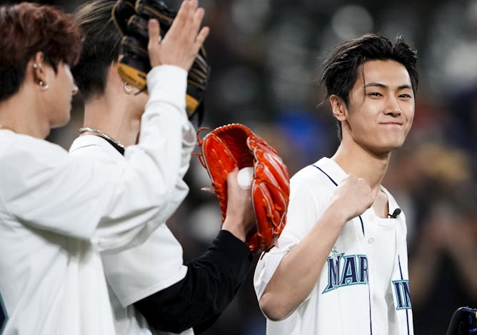 Jay Park, right, of K-pop band Enhypen, who was born in Seattle, prepares to throw ceremonial first pitches with bandmates before a Seattle Mariners game, April 29, 2024, in Seattle.