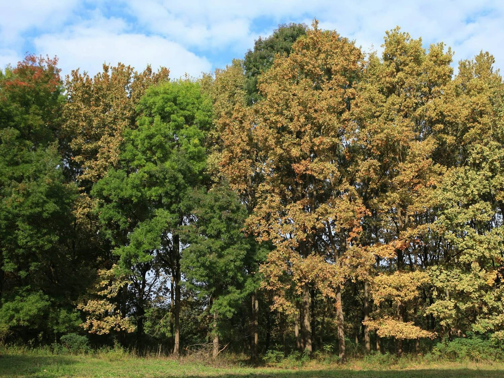 Chênes attaqués par Corythucha arcuata, à côté d’érables. Le contraste des couleurs est saisissant.