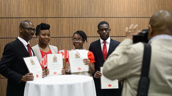 A Haitian family poses for a photograph after after taking the oath of citizenship on Parliament Hill in 2019.