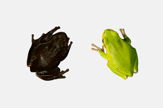 Extremes of the colour gradient of the Eastern San Antonio frog (Hyla orientalis). On the left, a specimen captured in Chernobyl inside the high contamination zone; on the right, a specimen captured outside the Exclusion Zone.