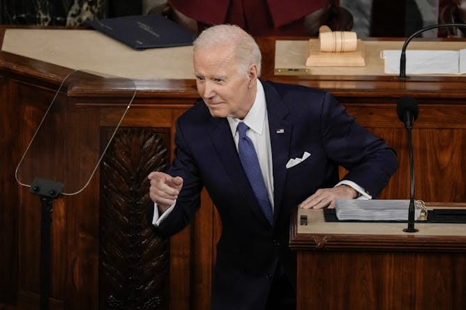 President Joe Biden gestures as he delivers his State of the Union address  on February 07, 2023 in Washington, DC.