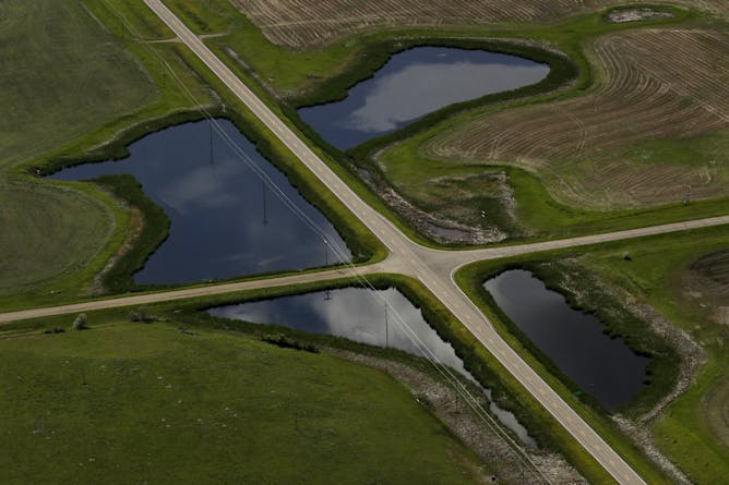 Roads divide what once was a larger wetland into four smaller pools in east-central North Dakota.