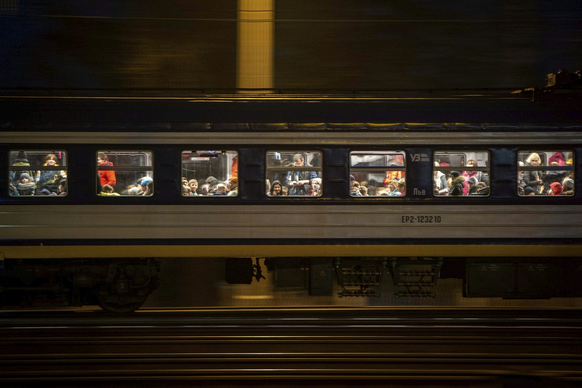 Un train avec des réfugiés fuyant l'Ukraine traverse la frontière à Medyka, en Pologne, le 7 mars 2022.