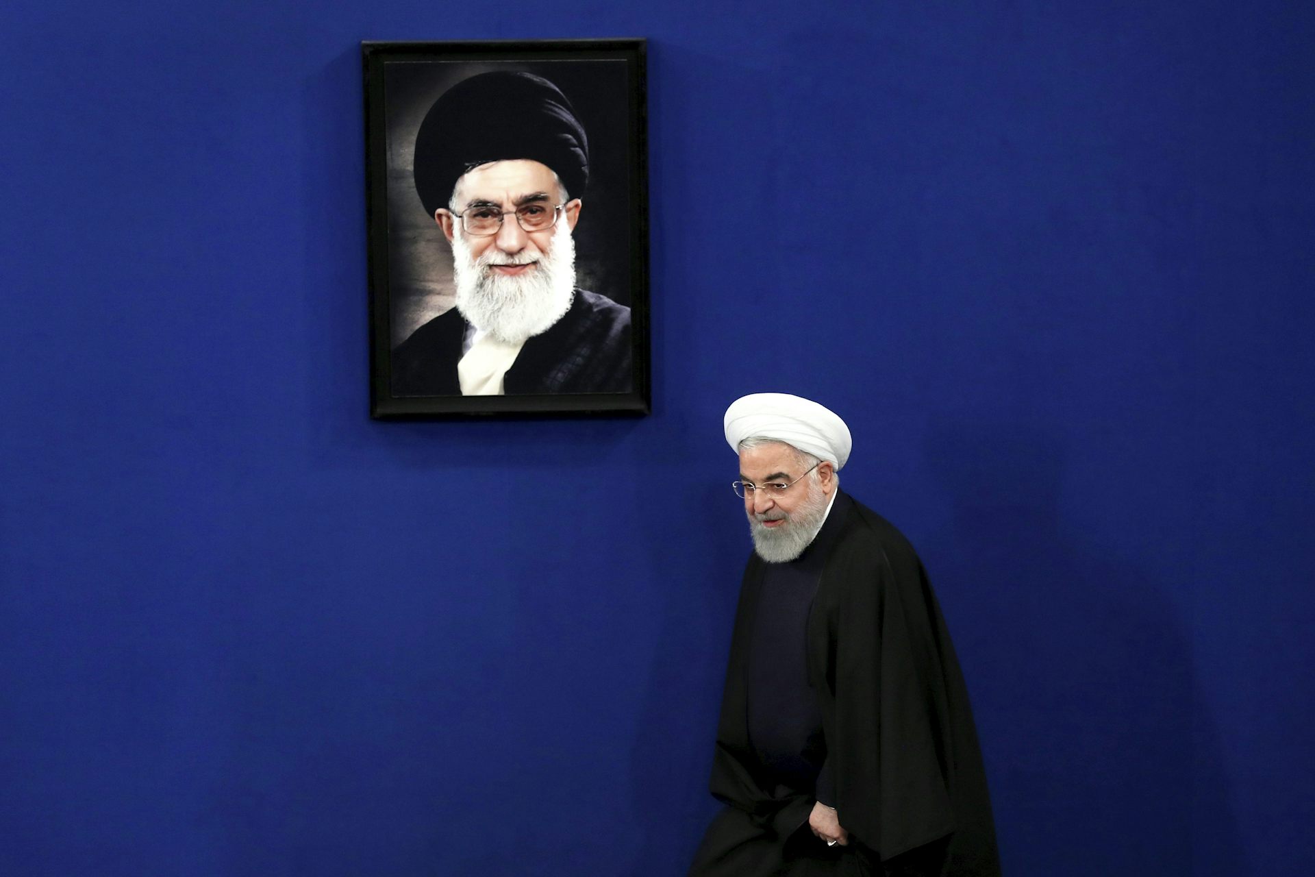Iran’s President Hassan Rouhani arrives for a news conference in Tehran, Iran, in February 2020, with a portrait of the Supreme Leader Ayatollah Ali Khamenei hanging on the wall behind him. Both men have signalled an interest in a new nuclear deal.