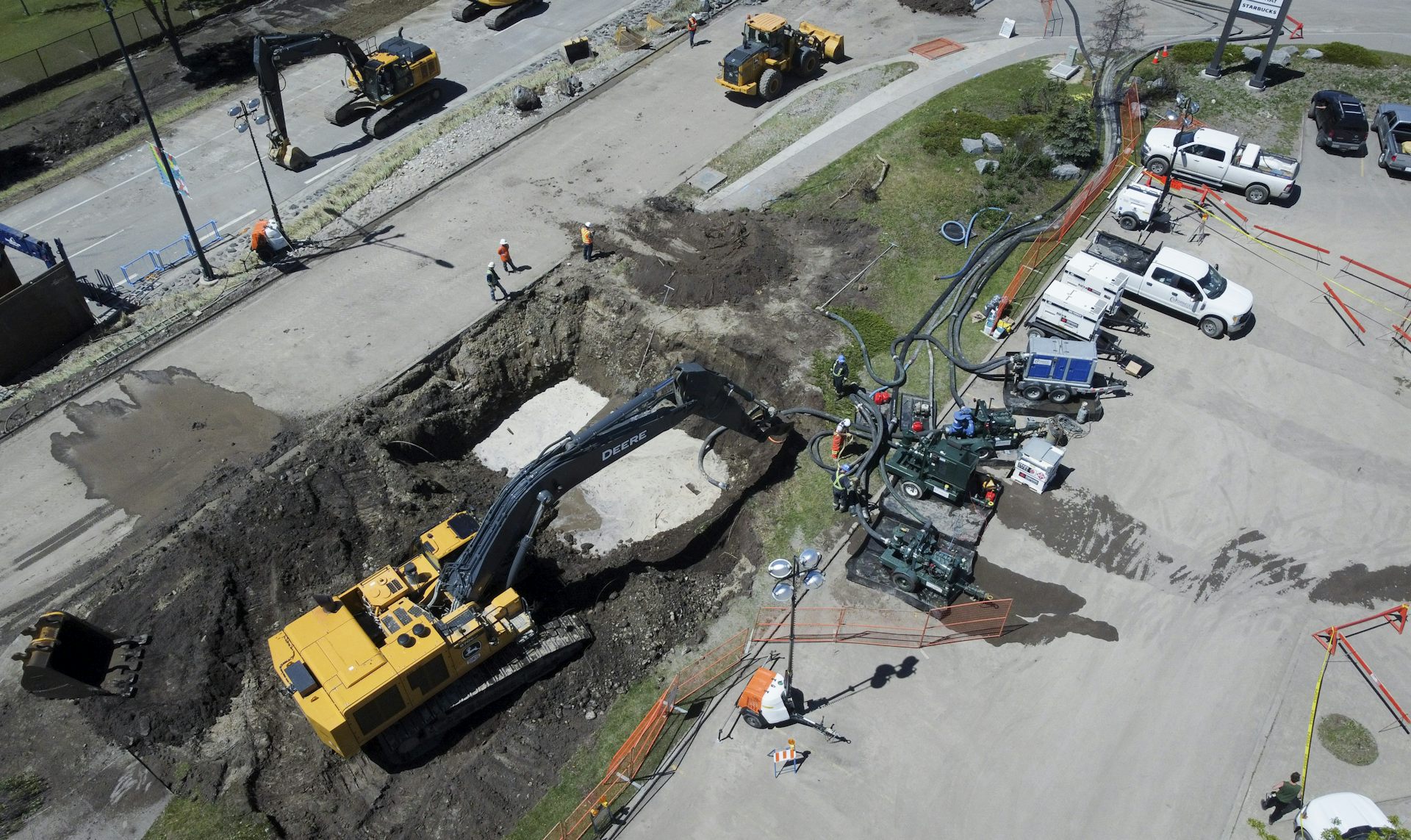 Workers race to repair a damaged water main in Calgary on Friday, June 7, 2024. Calgarians are being urged to keep reducing their water usage by 25 per cent as a result of the shortages this break caused.