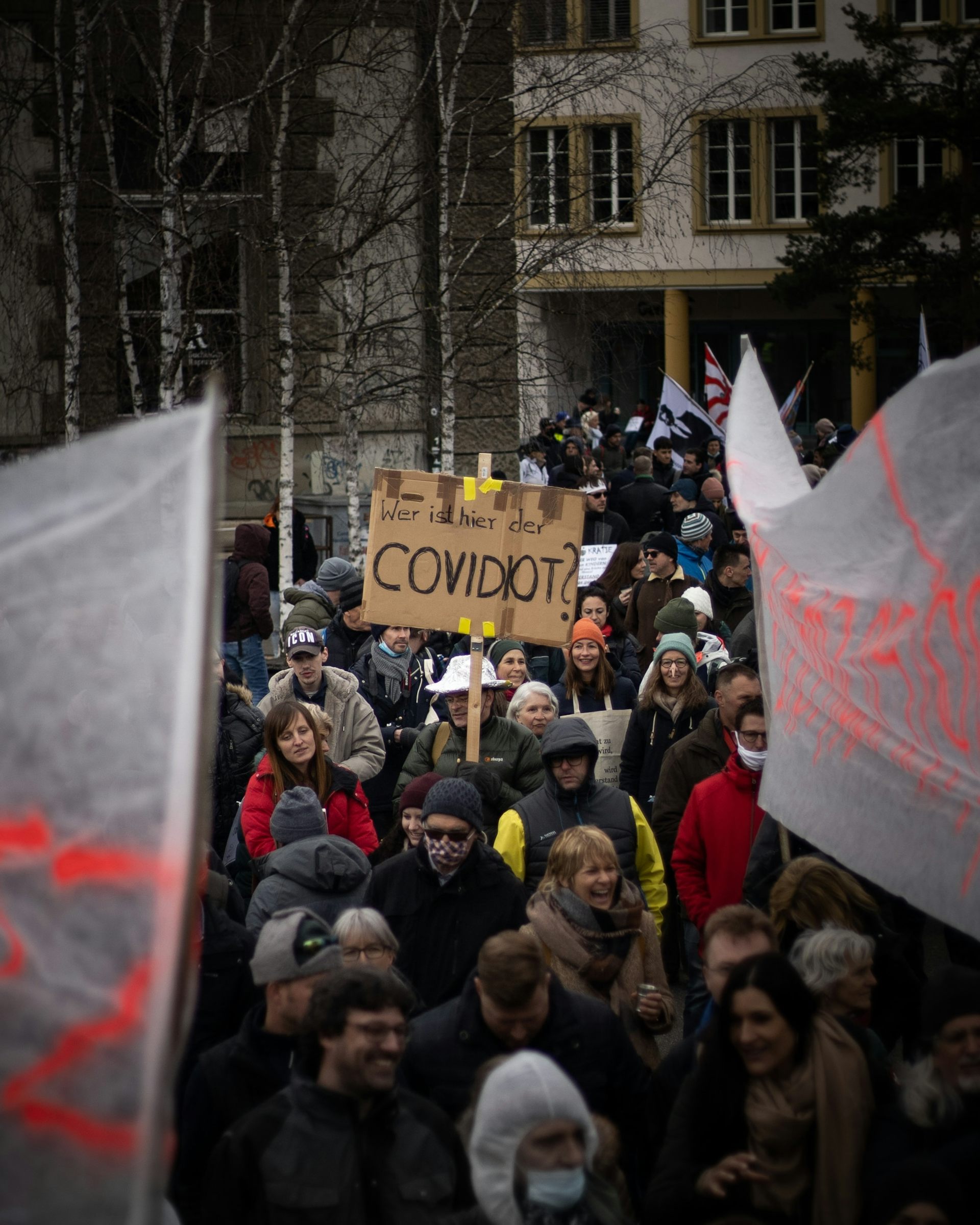 Man holds sign reading ‘wer ist hier der COVIDIOT’ which means ‘who is the COVIDIOT here?’ at a protest against pandemic restrictions in March, 2021.