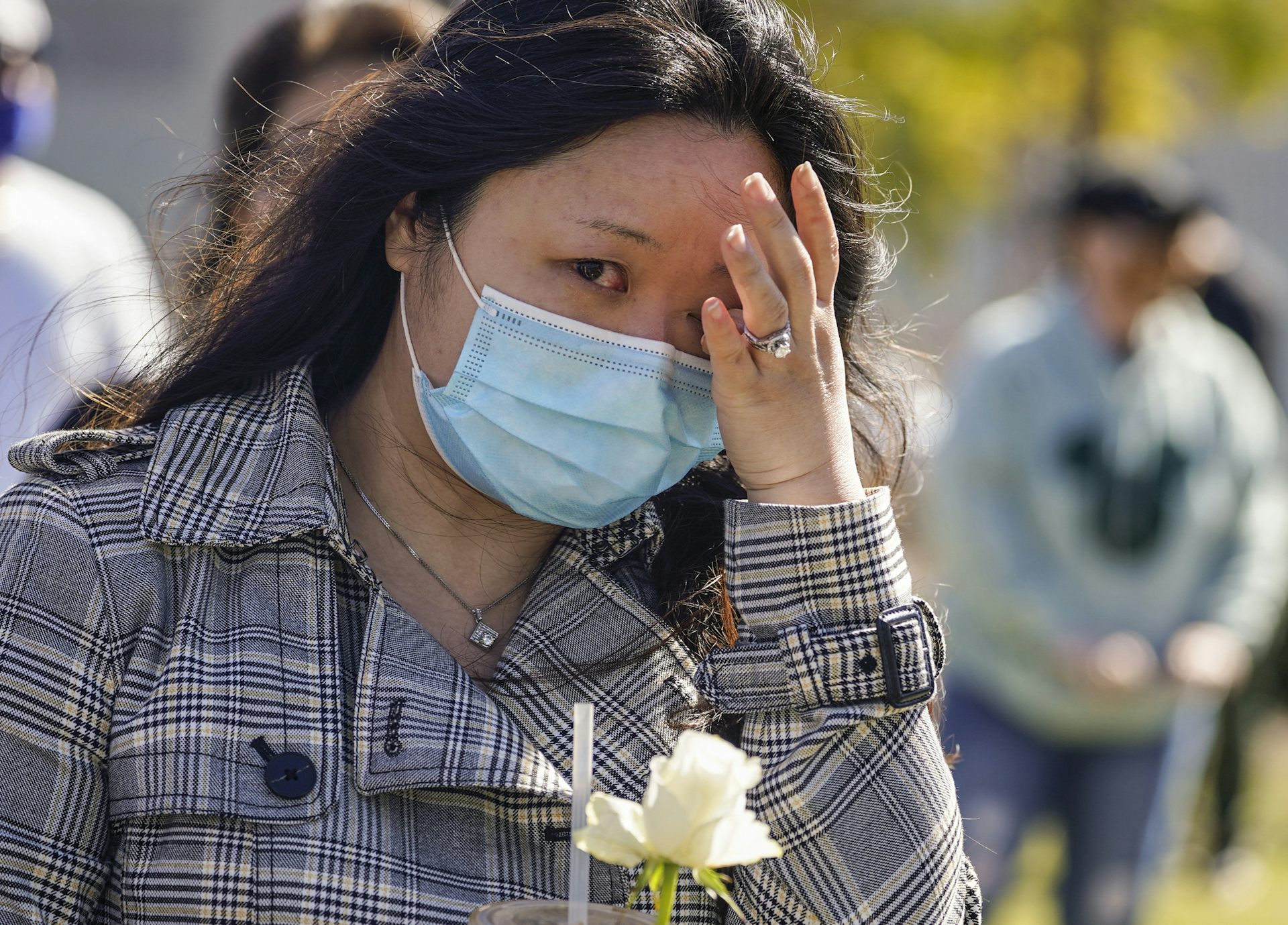 Une femme pleure en assistant à un rassemblement communautaire à Los Angeles pour sensibiliser à la violence et aux attitudes racistes à l'encontre des Asiatiques, en réponse à la série d'attaques dont ils ont été victimes pendant la pandémie.
