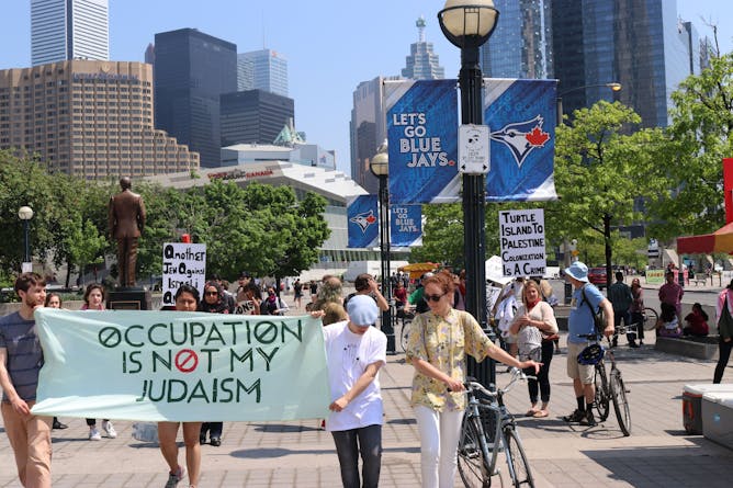 People carry a sign protesting Israeli actions in Palestine during a protest march in Toronto in May 2018.