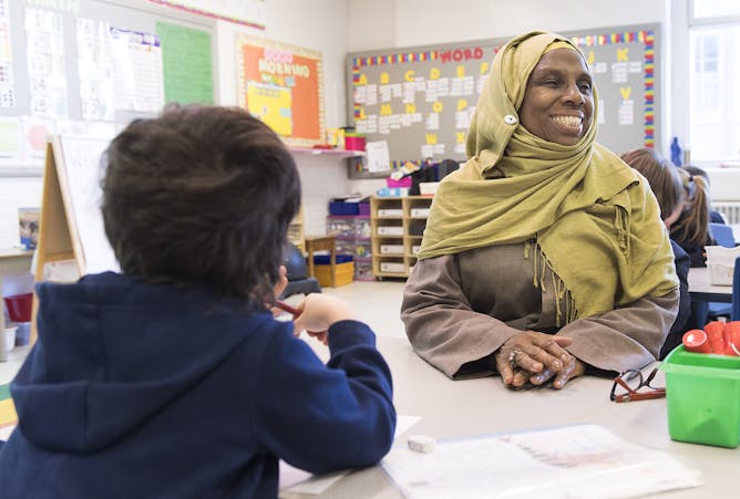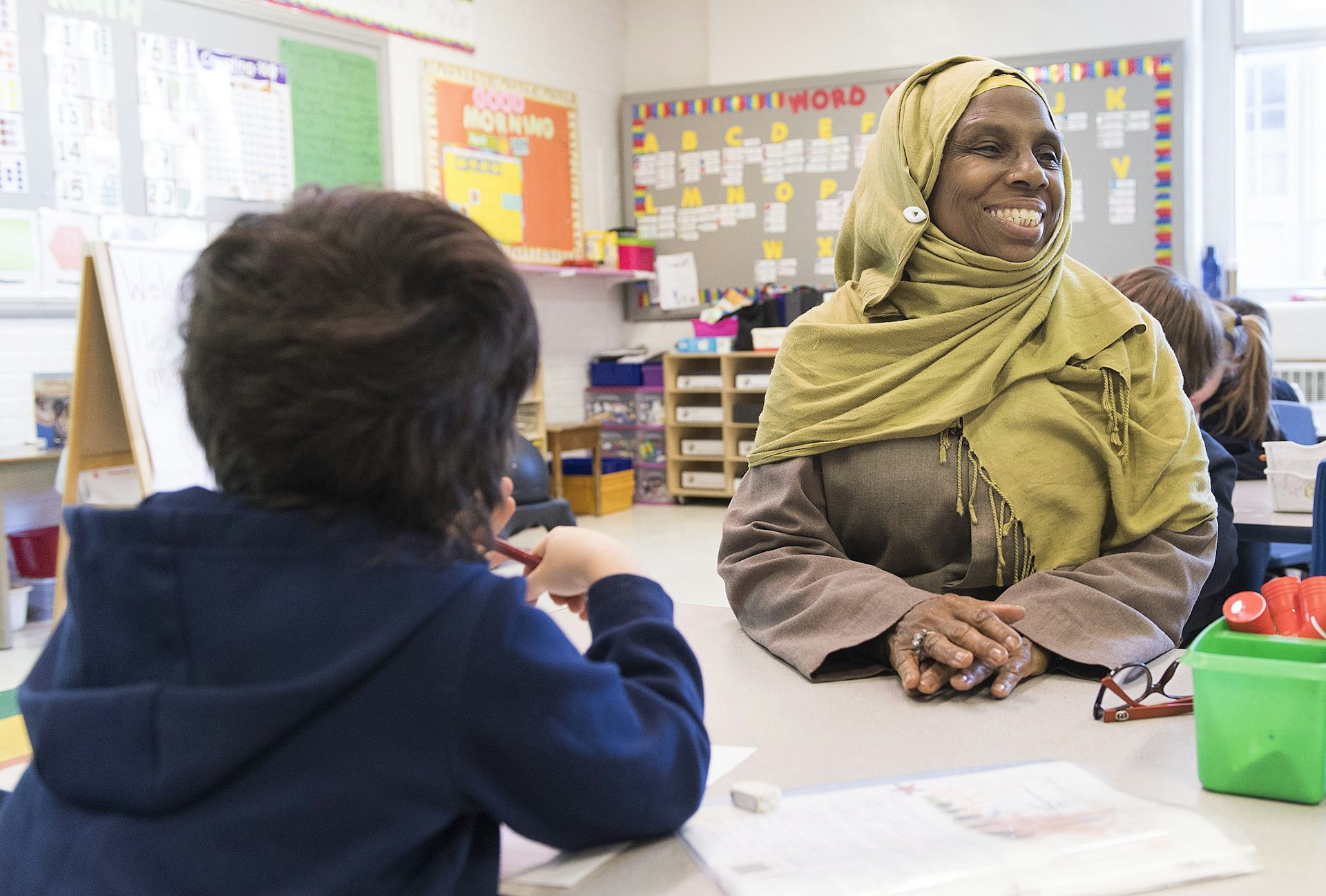 L'enseignante de maternelle Haniyfa Scott enseigne à son groupe, à Montréal, en avril 2019. Le projet de loi 21 interdit le port de symboles religieux aux nouveaux enseignants.