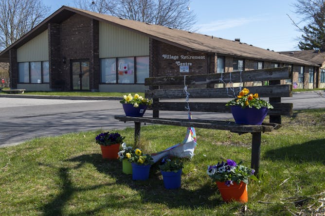Flowers sit on a bench in front of a for-profit long-term care home in Pickering, Ont., where dozen of seniors died of COVID-19, in April 2020.